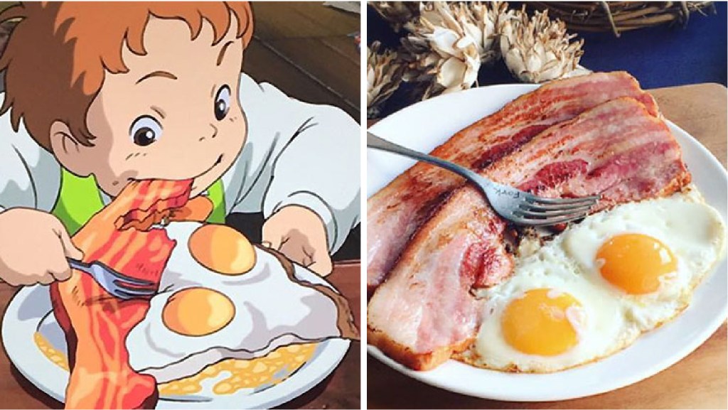 El desayuno épico de El increíble castillo vagabundo: Imagina esos huevos fritos con tocino grueso cocinados por Howl (y con la «ayuda» de Calcifer). Se ven tan reales que casi puedes escuchar el sonido de la sartén.